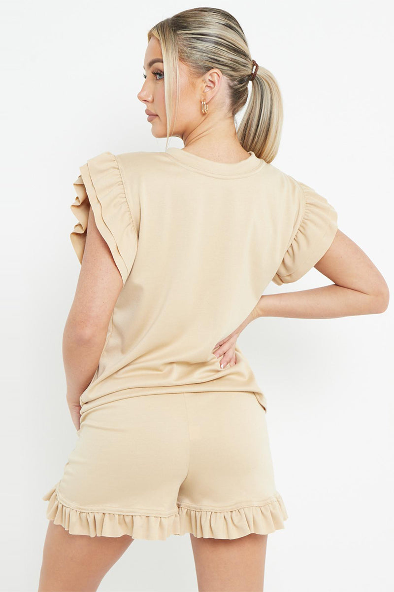 Trendy Ruffle Sleeve Loose Top & Drawstring Waist Shorts Co-ord